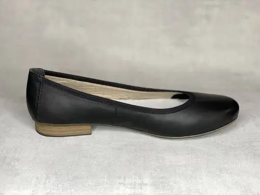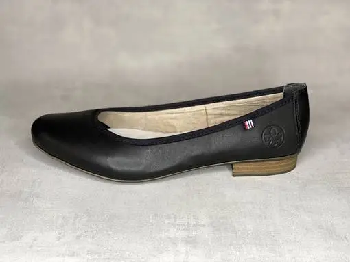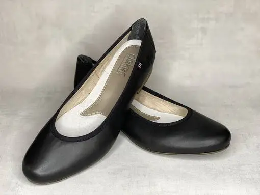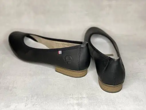 Mustat nahkaiset Rieker ballerinat. Klassinen ballerina, ulkosyrjällä Rieker-logo sekä pieni sini-valko-punainen kangasmerkki.