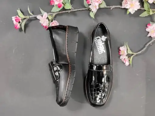 Riekerin kiilakorkokenkä on saanut koristuksekseen kiiltävät hapsut ja krokomaisen kärkikuvioinnin. Kiilakoron korkeus on noin 4cm, edestä pohjan korkeus noin 1,5cm.