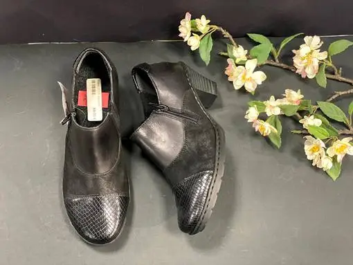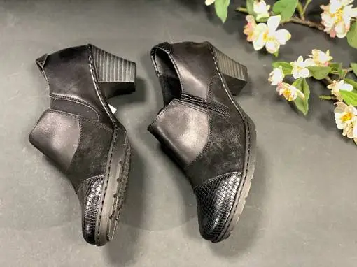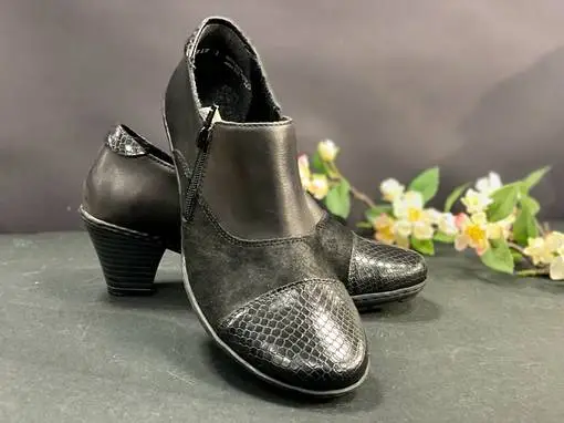 Riekerin kevyt ja tilava korollinen kävelykenkä. Kärjessä ja kannassa on suomukuvioitu osio. Vetoketju on sijoitettu yksityiskohdaksi kengän ulkosyrjälle, sisäsyrjällä on istuvuutta paranatava venyke. Koron korkeus noin 5,5cm.