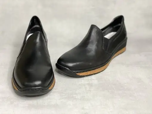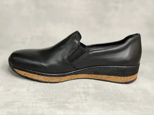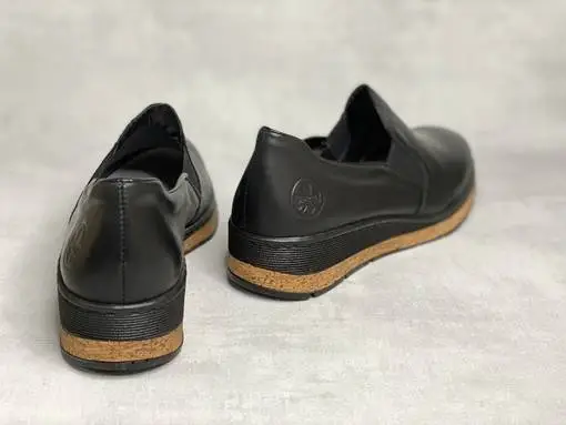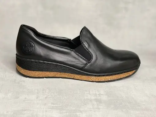 Mustat kiilapohjaiset Rieker kävelykengät. KEngän sisä- ja ulkosyrjällä on pienet pukemista helpottavat ja istuvuutta parantavat venykkeet. Pohjan reunaa kiertää korkkikuvioinen osio, jossa on kimmeltäviä yksityiskohtia. Kiinteän pohjallisen pinta on nahkaa.