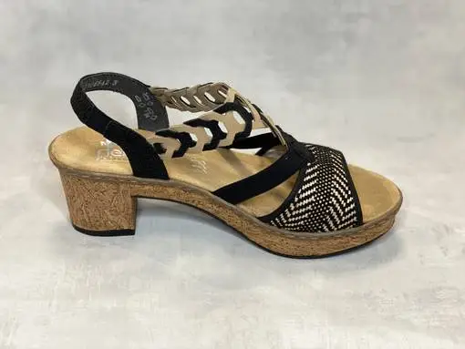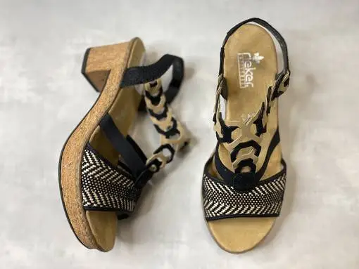 Mustat korolliset Rieker sandaalit beigeillä yksityiskohdilla. Kengän sisäsyrjällä on nilkkaremmissä pieni pukemista helpottava ja istuvuutta parantava venyke. Myös päkiän päälle tulevat vinoremmit ovat joustavat. Maltillinen koron korkeus. Korkkikuvioidussa pohjassa mukana myös hopeankimallusta.