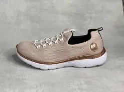 Hempeän vaaleanpunaiset Sneaker by Rieker tennarit. Valkoiset venykenauhat ja pohjan yläreunaa kiertää ihana pronssinvärinen raita. Ulkosyrjällä tumman kullan värinen pyöreä Rieker-logo. Ulkopohja on valkoinen. Kengän kannassa on vetolenkki ja kapea heijastava osio. Tennareissa on kiinteiä jalan muotoihin mukautuva Memory Foam pohjallinen.