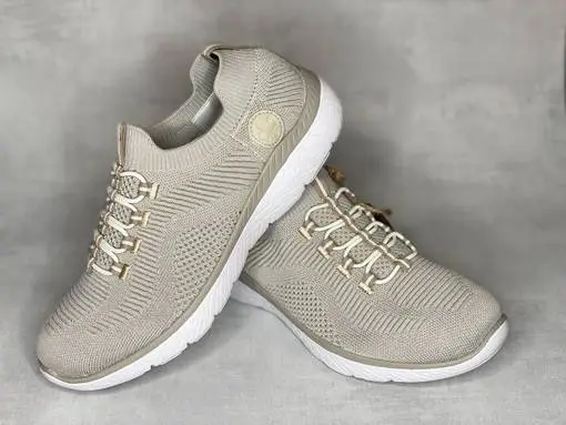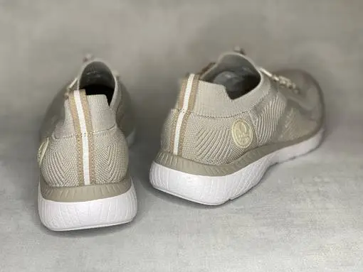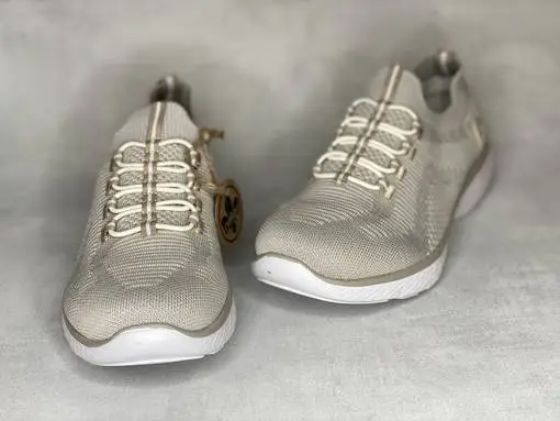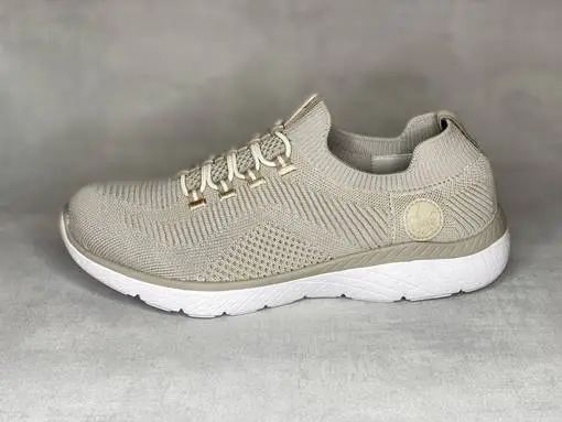 Kevyesti kimaltavat beiget Sneaker by Rieker kävelykengät. Pehmeät jalkaan mukautuvat MemoSoft pohjalliset. Joustavat venykenauhat ja jalkaa myötäilevä joustava tekstiilipinta. Hyvin joustava kengänsuu.