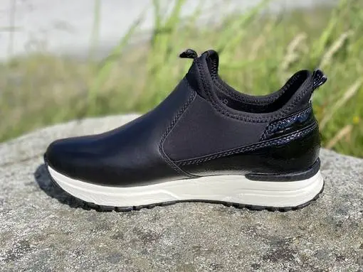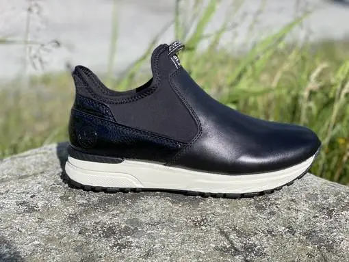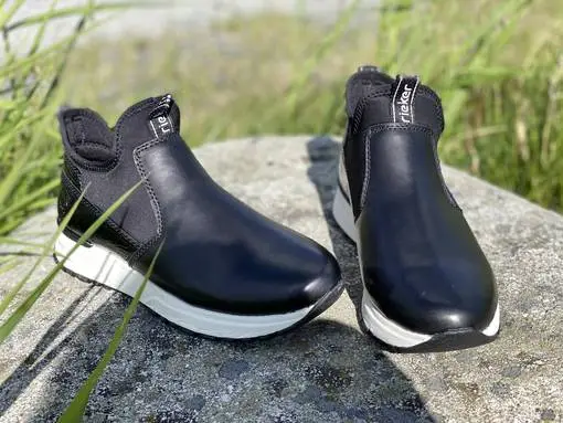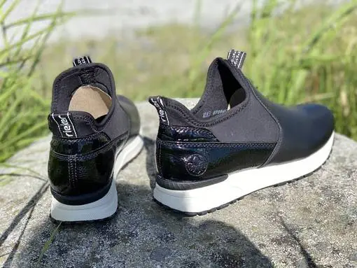 Mustat Sneaker by Rieker nahkaiset nilkkurit. Kannassa ilmettä tuomassa lakerinahkainen osio. Kannan ja kenkän etureunan lenkit tekstiiliä, jossa rieker-teksti. Vaihdettavan pohjallisen tilalle sujahtaa helposti omaan jalkaasi parhaiten sopiva pohjallinen. Kengän sisä- ja ulkosyrjällä on joustavaa tekstiiliä, joka helpottaa pukemista ja parantaa kengän istuvuutta.
