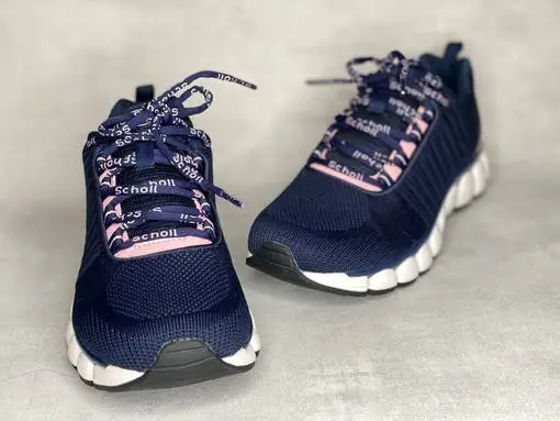 Tummansiniset Scholl Biomechanics® lenkkarit. Vaaleanpunaiset yksityiskohdat viimeistelevät kengän ulkonön. Valko-musta veikeästi muotoiltu ulkopohja. Muotoiltu Biomechanics® -pohjallinen on vaihdettavissa, joten kenkään sujahtaa vaivattomasti omia tarpeitasi parhaiten vastaavat pohjalliset.