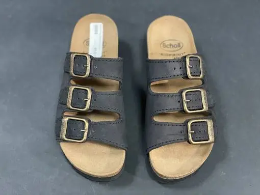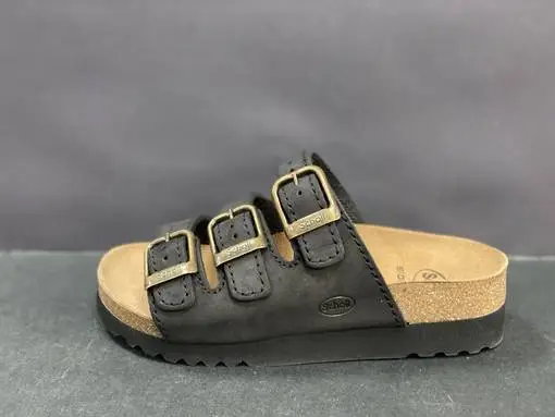 Schollin musta remmisandaali, jossa on Bioprint adapta-jalkapeti. Sisäpohja on suunniteltu ehkäisemään ja vähentämään väärän asennon aiheuttamia polvikipuja. Näillä sandaaleilla jalka on hyvin tuettu ja askellus taittuu rennosti.