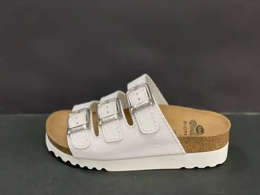 Sandaalin kaikki kolme hihnaa ovat säädettäviä, joten kengän saa kiristettyä sopivaksi omaan jalkaan. Pieni kiilakorko mahdollistaa jalalle mukavan asennon kengässä. Kengän pinta on nahkaa ja sisäpohja mokkanahkaa, jalkapeti on yhdistelmä korkkia ja lateksia.
