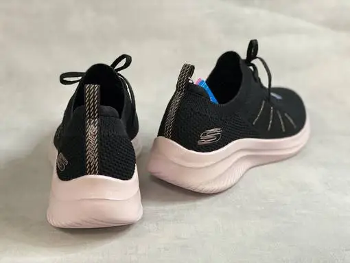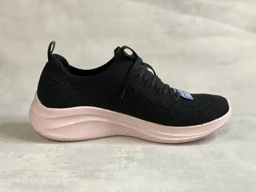 Mustat Skechers Ultra Flex 3.0 Glowing Sky venykelenkkarit. Ulkopohja on hempeän vaaleanpunainen ja glitterinkimalteinen. Ulkosyrjällä on metallinhohtoiset koristetikkaukset. Kengän joustava pinta mukautuu jalkaan mainiosti ja nauhojen avulla on helppoa tehdä pientä hienosäätöä istuvuuden suhteen. Pehmeä Memory foam pohjallinen mukautuu jalkaan.