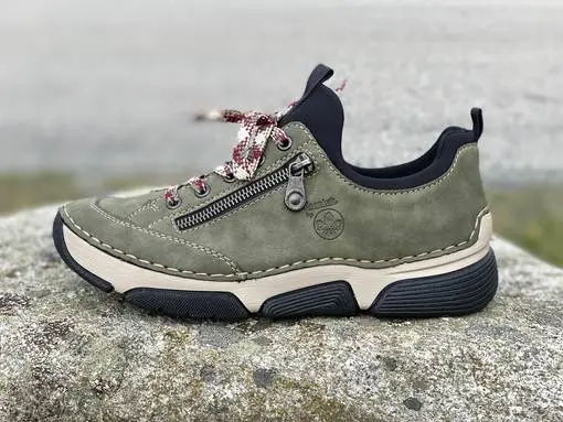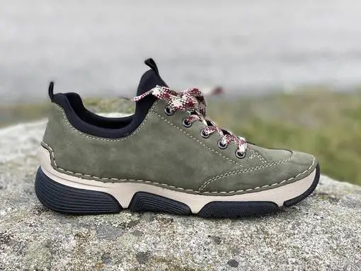 Vihreät Sneaker by Rieker tennarit. Nahkapintainen antistress-sisäpohjallinen. Ulkosyrjällä koristevetoketju. Tennarin ulkonäön viimeistelevät kolmiväriset kengännauhat, joissa toistuu kengän vihreä, murrettu punainen ja valkoinen. Kaksivärinen ulkopohja.
