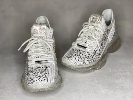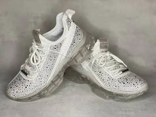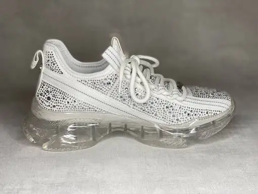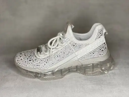 Valkoiset upeasti kimaltavat Steve Madden Maxima-R lenkkarit! Ärhäkästi muotoiltu läpiukuultava ulkopohja, kengän pinnassa puolestaan lyömätön valkoisen ja hopeankimalluksen liitto! Käännä katseet, erotu joukosta ja kirmaa kesään kimaltavat kengät jalassa! Vaihdettavien pohjallisten ansiosta voit tarvittaessa vaihtaa näihin lenkkareihin omiin jalkoihisi parhaiten istuvat pohjalliset.