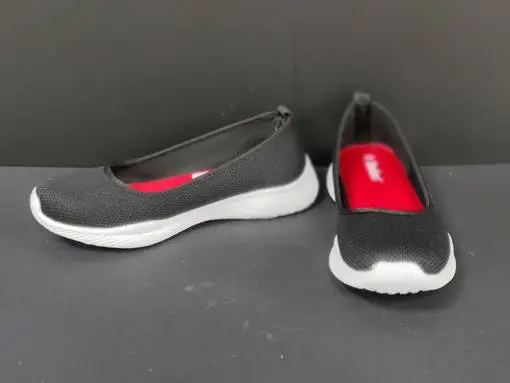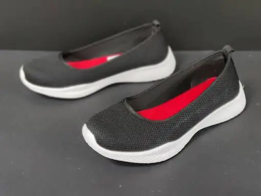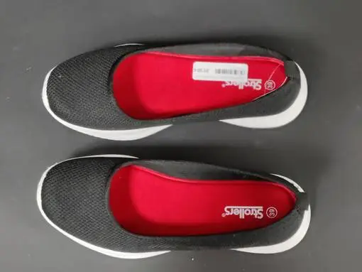 Mustassa ballerinassa on jalkaan mukautuva memory foam pohjallinen. Pohja on valkoinen. Nämä näyttää kivalta myös kenkähyllyssä, kun sisäpohja on pirteän punainen. Kannan korkeus noin 2,5cm, edestä noin 1,5cm.