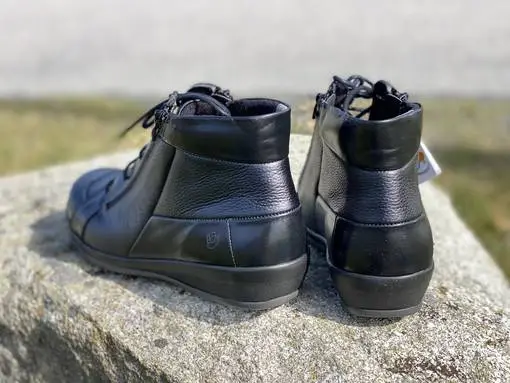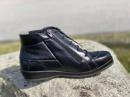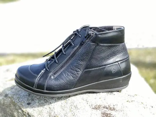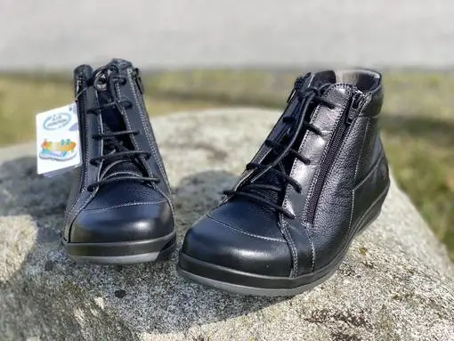 Mustat leveälestiset Suave Bristol nilkkurit. Kaksi pukemista helpottavaa vetoketjua, joiden ansiosta kenkä aukeaa pitkälle kärkeen asti ja on helppo pukea myös kipeään tai arkaan jalkaan. Nauhoituksen avulla kengän voi säätää omaan tarpeeseen sopivan kireäksi tai riittävän väljäksi. Kevyesti muotoiltu pohjallinen on irrotettava ja voit tarvittaessa säätää kengän sisätilaa lisäämällä pohjallisen alle tasaisen pohjallisen tai vaihtaa sen kokonaan oman jalkasi tarpeita parhaiten vastaavaan pohjalliseen.