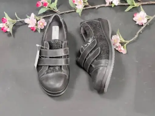 Leveäslestinen Suaven kävelykenkä kevyesti kuvioidulla pinnalla ja kahdella tarrallisella remmillä. Kävelykengässä on kaksi tarrallista remmiä sekä pehmeä pohjallinen, jonka voit tarpeen vaatiessa vaihtaa itsellesi parhaiten sopivaan. Kiilakorollisen kannan korkeus noin 3cm, edestä noin 1,5cm.