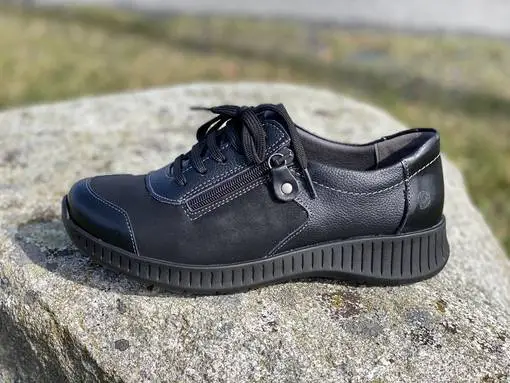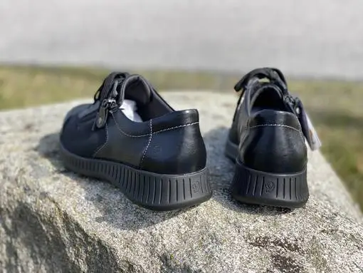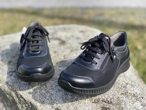 Mustat leveälestiset Suave Geneve kävelykengät. Ulkosyrjällä pukemista helpottava vetoketju. Nauhoituksen avulla kengät säätyvät sujuvasti omaan jalkaan sopiviksi. Vaihdettavien pohjallisten tilalle sujahtaa tarpeen vaatiessa vaivattomasti omaan jalkaasi parhaiten sopivat pohjalliset. Voit myös lisätä pohjallisen alle toisen, tasaisen pohjallisen, jolloin kengät istuvat jalkaan napakammin. Sisävuori on hengittävää, antibakteerista microfiber-kuitua. Kengän kannassa on Air Function -iskunvaimennus.