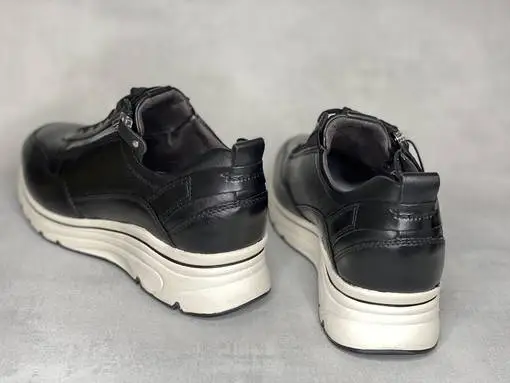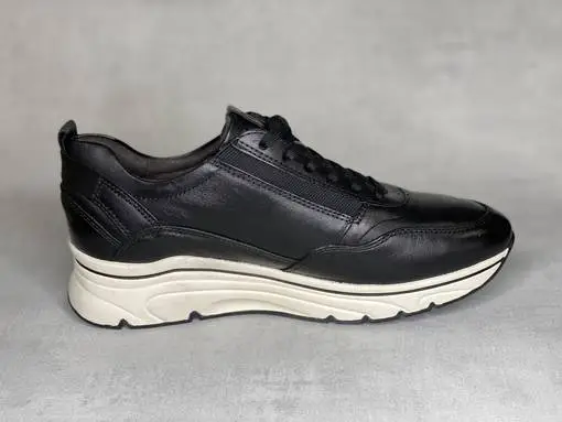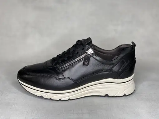 Mustat kiilakantaiset Tamaris lenkkarit. Ulkosyrjällä vetoketju, sisäsyrjällä venyke sekä nauhat. Kevyesti muotoiltu PureRelax pohjallinen, joka on tarpeen vaatiessa vaihdettavissa omaan jalkaasi parhaiten sopiviin pohjallisiin. Kannan korkeus noin 4cm, pohja edestä noin 2cm.