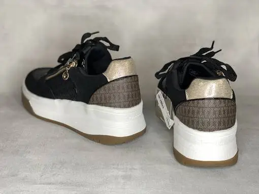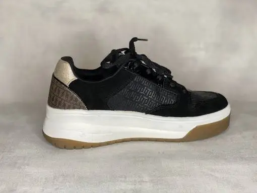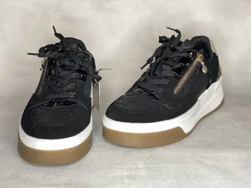 Mustat paksupohjaiset Tamaris tennarit. Nauhat ja ulkosyrjälle yksityiskohdaksi sijoitettu vetoketju, joka helpottaa myös pukemista. Näyttävä kullanvärinen vedin Tamariksen T-logolla varustettuna. Vaihdettavan pohjallisen tilalle sujautat tarvittaessa vaivattomasti omaan jalkaasi parhaiten sopivan pohjallisen. Kärjestä kantapäähän asti tyylikäs tennari.