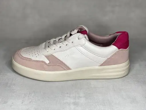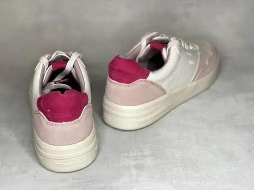 Valkoiset Tamaris Rose Comb tennarit fuksianpunaisin ja vaaleanpunaisin yksityiskohdin. Vaihdettava pohjallinen, jonka tilalle sujautat tarvittaessa vaivattomasti omaan jalkaasi parhaiten sopivat pohjalliset.