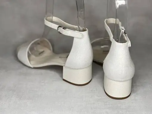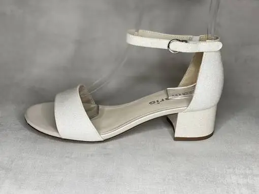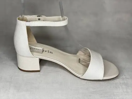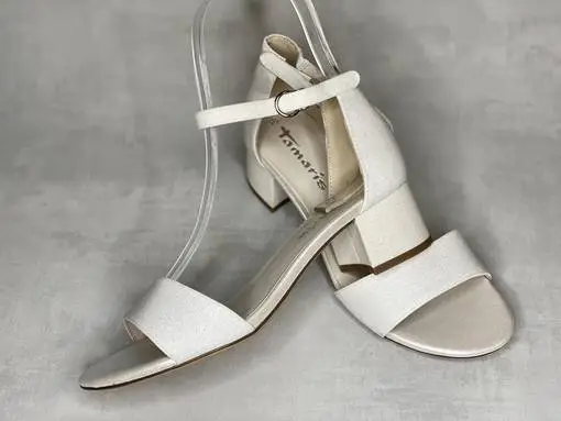 Kimaltavat valkoiset Tamaris sandaalit. Solkikoristeinen tarrallinen nilkkaremmi on helppo avata ja sulkea. Matala korko on myös kauttaaltaan glitterinkimalteinen.