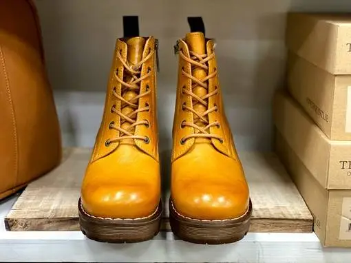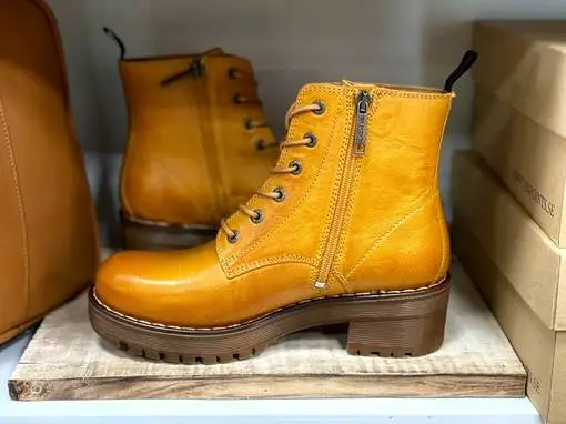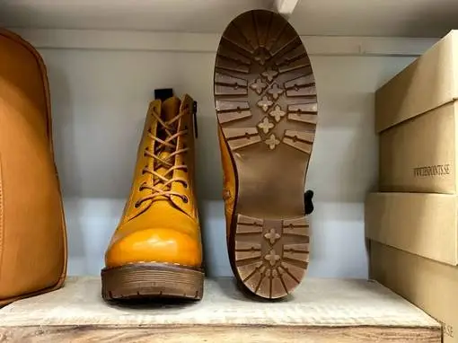 Nauhat ovat pinnan keltaiseen väriin sointuvan keltaiset ja sisäsyrjän vetoketju helpottaa pukemista. Kannan korkeus noin 5cm, pohja edestä noin 2,5cm