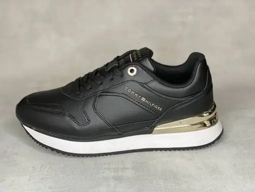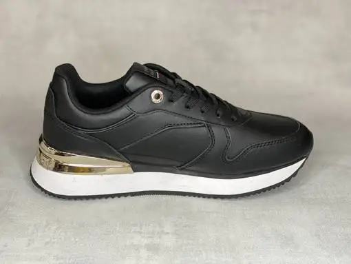 Mustat Tommy Hilfiger Elevated Feminine Leather Runner citytennarit. Ylkopohjan sivu on valkoinen ja kannassa on kullanvärinen yksityiskohta. Ulkosyrjällä kullanvärinen Tommy Hilfiger teksti logolla. Irrotettva pohjallinen, joten sujautat kenkiin tarpeen vaatiessa juuri sinun jalkaasi parhaiten sopivat pohjalliset.