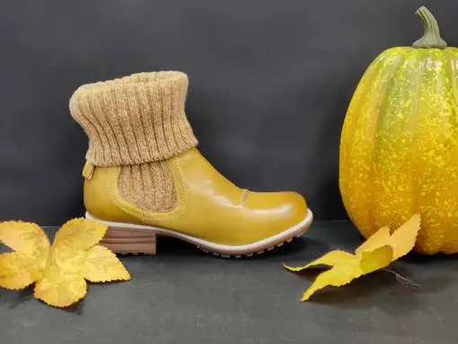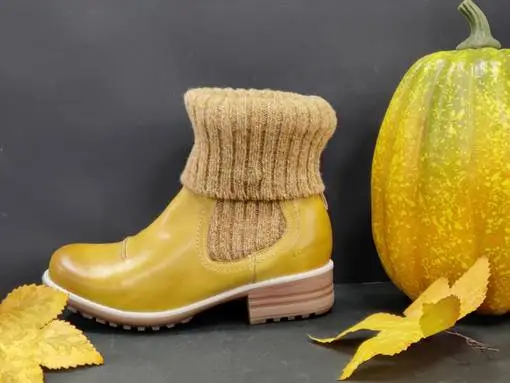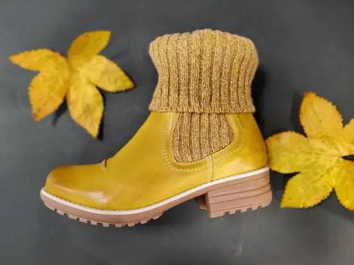 Keltainen nahkanilkkuri neulosvarrella. Topman on suunnitellut nämä upeat jalkineet suomalaiseen jalkaan sopiviksi. Lestiltään tämä kenkä on leveä. Neulosvarren alle on piilotettu venykkeet, joiden avulla kenkä istuu hyvin jalkaan. Sisävuori on villasekoitetta, joka auttaa pitämään jalat lämpiminä. Kannan korkeus on varsin maltillinen 4cm, pohjan korkeus edestä noin 1,5cm.