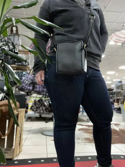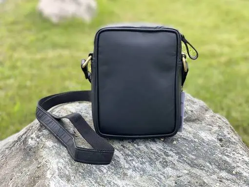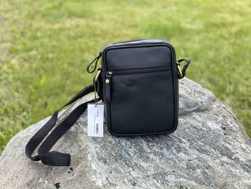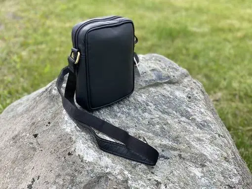 Musta nahkainen pikkulaukku. Laukku pysyy kiinni vetoketjulla ja laukun ulkopuolella on yksi vetoketjullinen sivutasku, vetimissä nahkalenkki. Päätaskun puolelta löytyy yksi vetoketjullinen sisätasku. Säädettävä hihna noin 80-150cm välillä, hihnan toinen puoli tekstiiiä, toinen nahkaa.