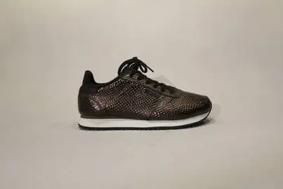 Ruskea nahkakenkä on pintakuvioitu näyttävällä krokokuosilla. Irrotettavassa sisäpohjallisessa on pinnassa korkkikuviointi. Kannan korkeus noin 2cm, edestä noin 1,5cm.